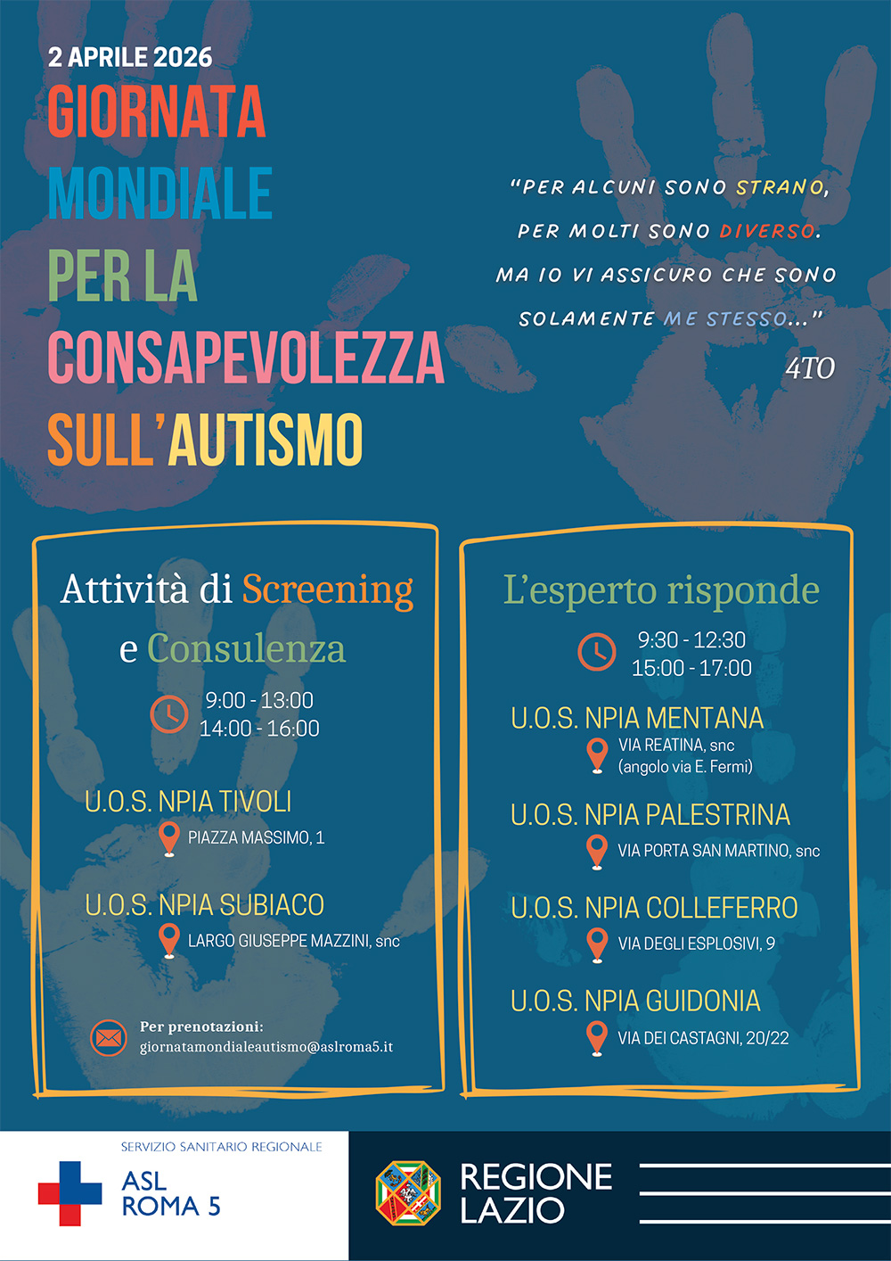 Nella stessa giornata sarà inoltre possibile accedere, dalle 9:00 alle 13:00 e dalle 14:00 alle 16:00, agli appuntamenti di screening e consulenza presso il Servizio di Neuropsichiatria Infantile di Tivoli e Subiaco (attività su prenotazione, inviare la richiesta a giornatamondialeautismo@aslroma5.it entro venerdì 27 marzo).