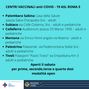CENTRI VACCINALI anti Covid-19 sono aperti ogni sabato dalle ore 8:00 alle ore 20:00