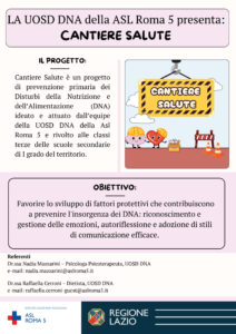 La ASL Roma 5 prosegue il proprio impegno nella prevenzione dei Disturbi della Nutrizione e dell’Alimentazione (D.N.A.) con il progetto Cantiere Salute rivolto ai ragazzi