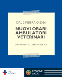 Si comunicano i nuovi orari di apertura degli ambulatori veterinari della ASL ROMA 5 in vigore dal 02 febbraio 2026, contestualmente si comuinica che dalla