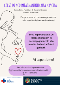 È in partenza dal 26 Marzo il corso di accompagnamento alla nascita per mamme e papà. Per informazioni Tel: 0774 811 53 79 E-mail: consultorio.olevanoromano@aslroma5.it