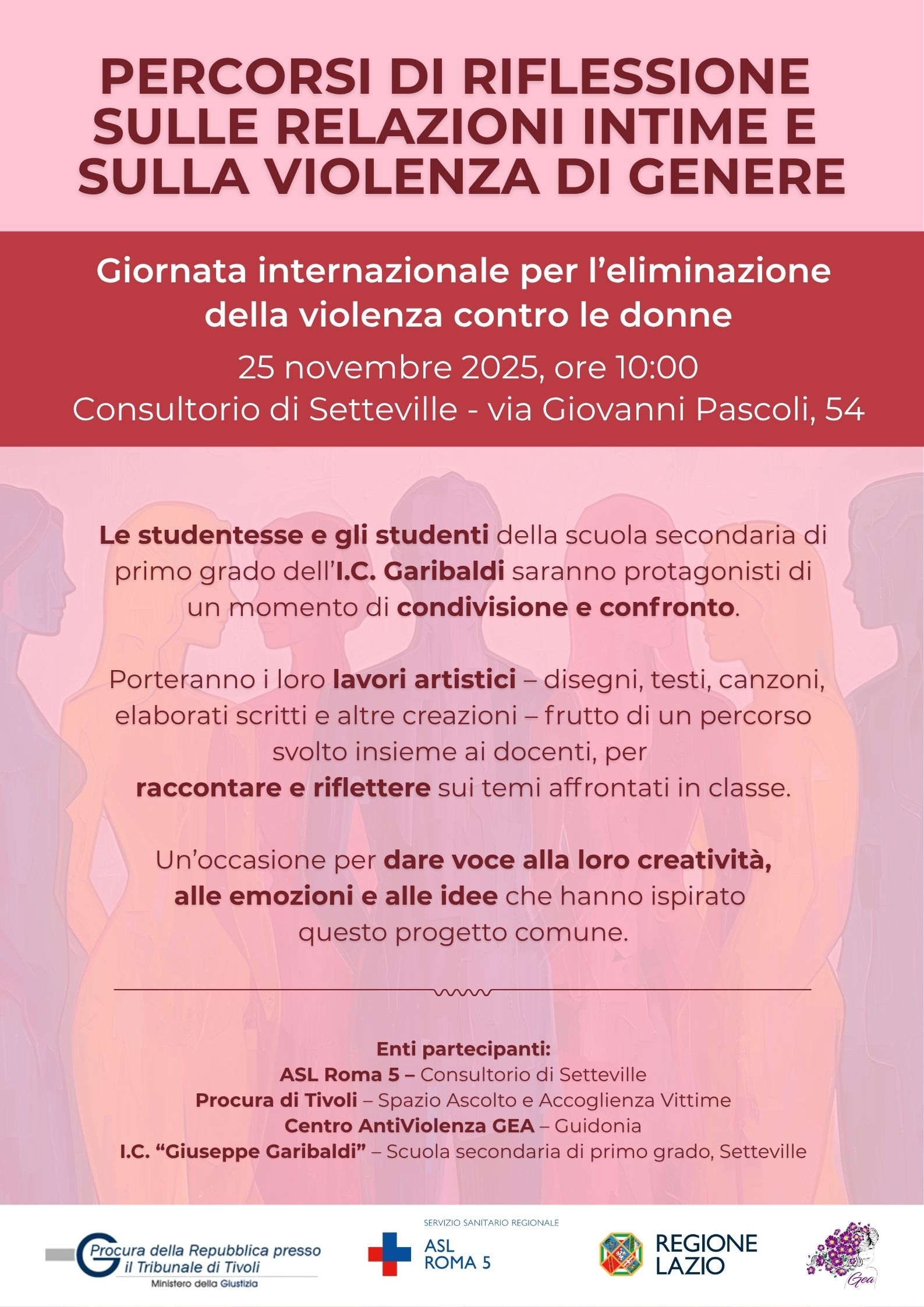 In occasione della Giornata Internazionale per l’Eliminazione della Violenza contro le Donne il Consultorio di Setteville e lo Spazio Ascolto e Accoglienza Vittime della Procura di Tivoli, in collaborazione con il Centro AntiViolenza GEA e l’Istituto Comprensivo Giuseppe Garibaldi, propongono dei percorsi di riflessione sulle relazioni intime e sulla violenza di genere dando spazio alle studentesse e agli studenti della scuola secondaria di primo grado attraverso l’esposizione dei lavori artistici svolti insieme ai docenti.