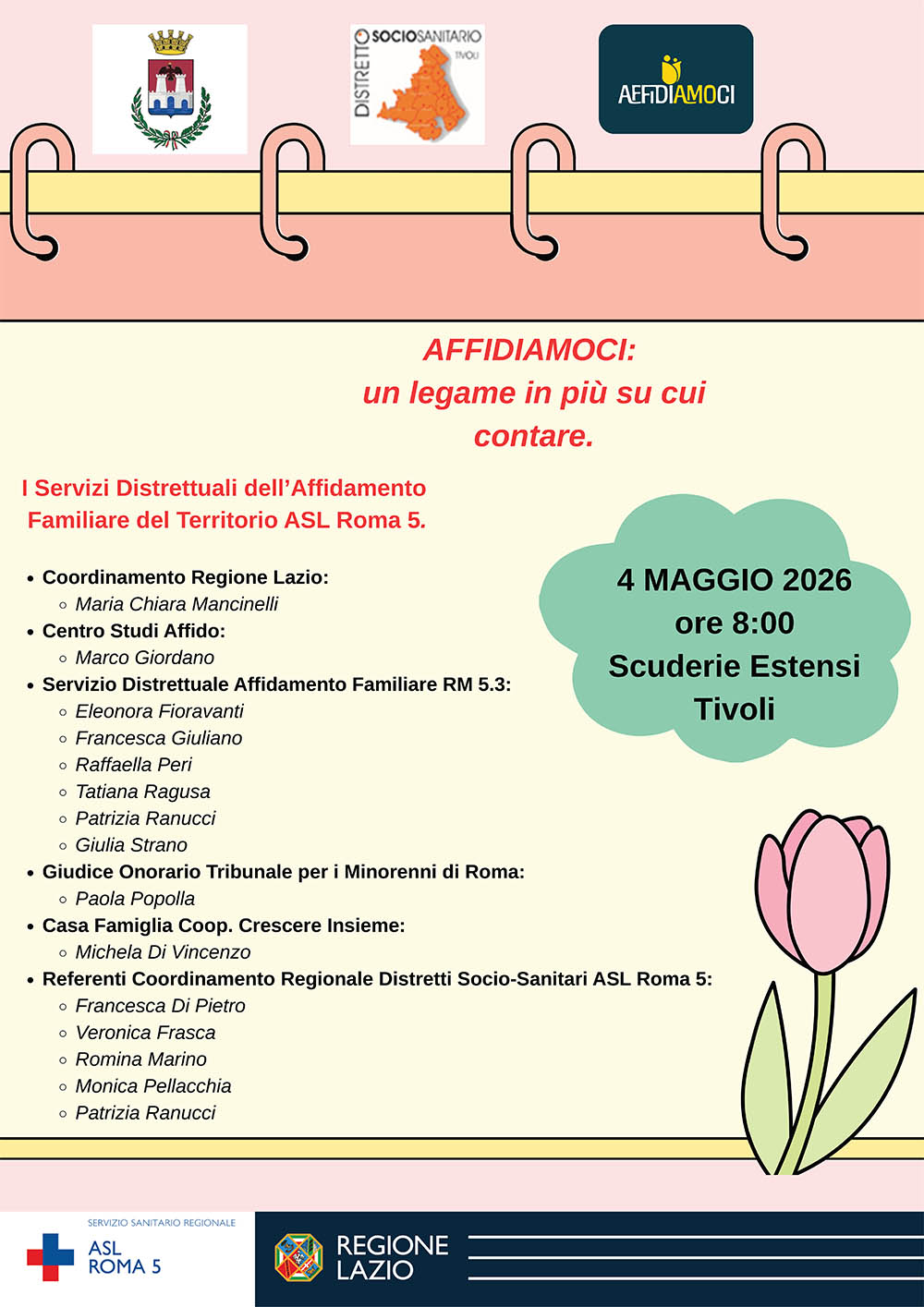 Il 4 maggio 2026 in occasione della Giornata Nazionale dell’Affidamento Familiare si terrà la 1° edizione dell’evento formativo “AFFIDIAMOCI..un legame in più su cui contare. I Servizi Distrettuali dell’Affidamento Familiare del Territorio ASL Roma 5” presso le scuderie Estensi site a Tivoli a Piazza Giuseppe Garibaldi.