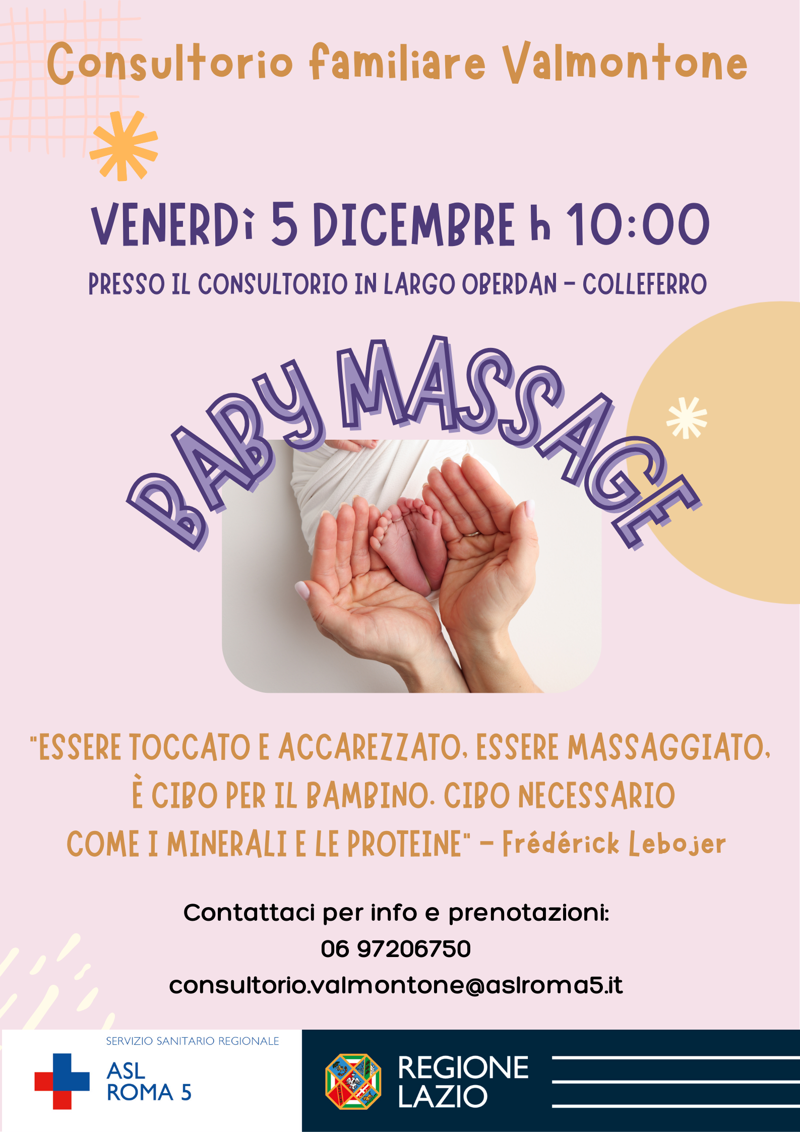Il Consultorio di Valmontone e Colleferro hanno il piacere di invitare mamme, papà e i proprio piccoli in un incontro dedicato al massaggio infantile, un modo di comunicare profondo e un efficace strumento attraverso cui rafforzare la relazione con il proprio bambino.