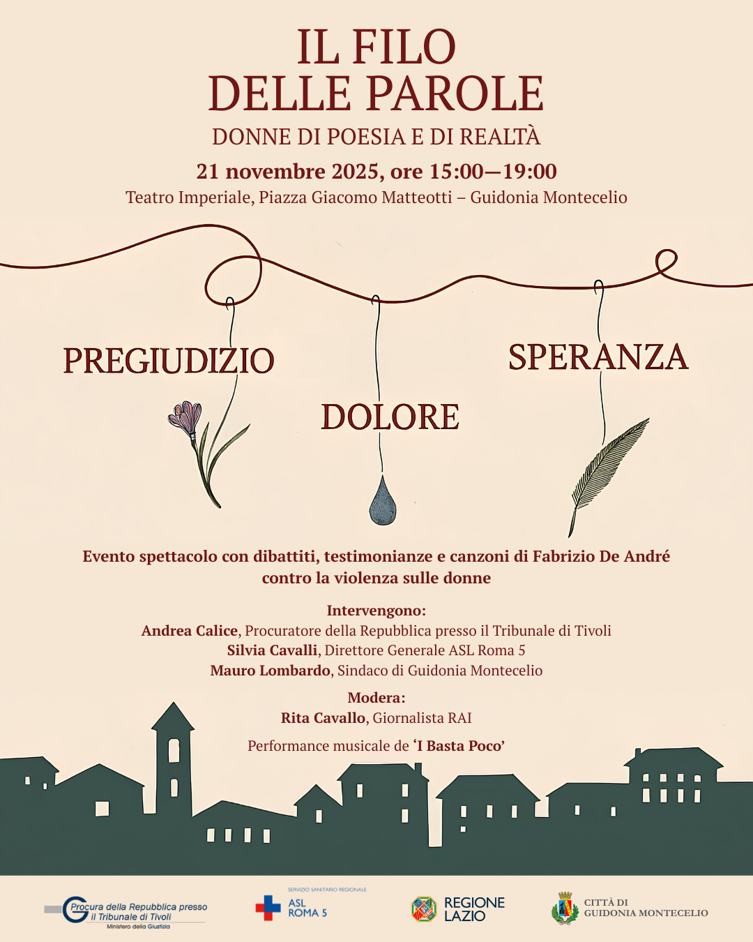 Venerdì 21 novembre 2025, dalle 15:00 alle 19:00, il Teatro Imperiale di Guidonia Montecelio ospiterà “Il Filo delle Parole – Donne di poesia e di realtà”, evento a ingresso libero organizzato da ASL Roma 5, Procura della Repubblica presso il Tribunale di Tivoli e Comune di Guidonia Montecelio nell’ambito delle celebrazioni della Giornata internazionale per l’eliminazione della violenza contro le donne.