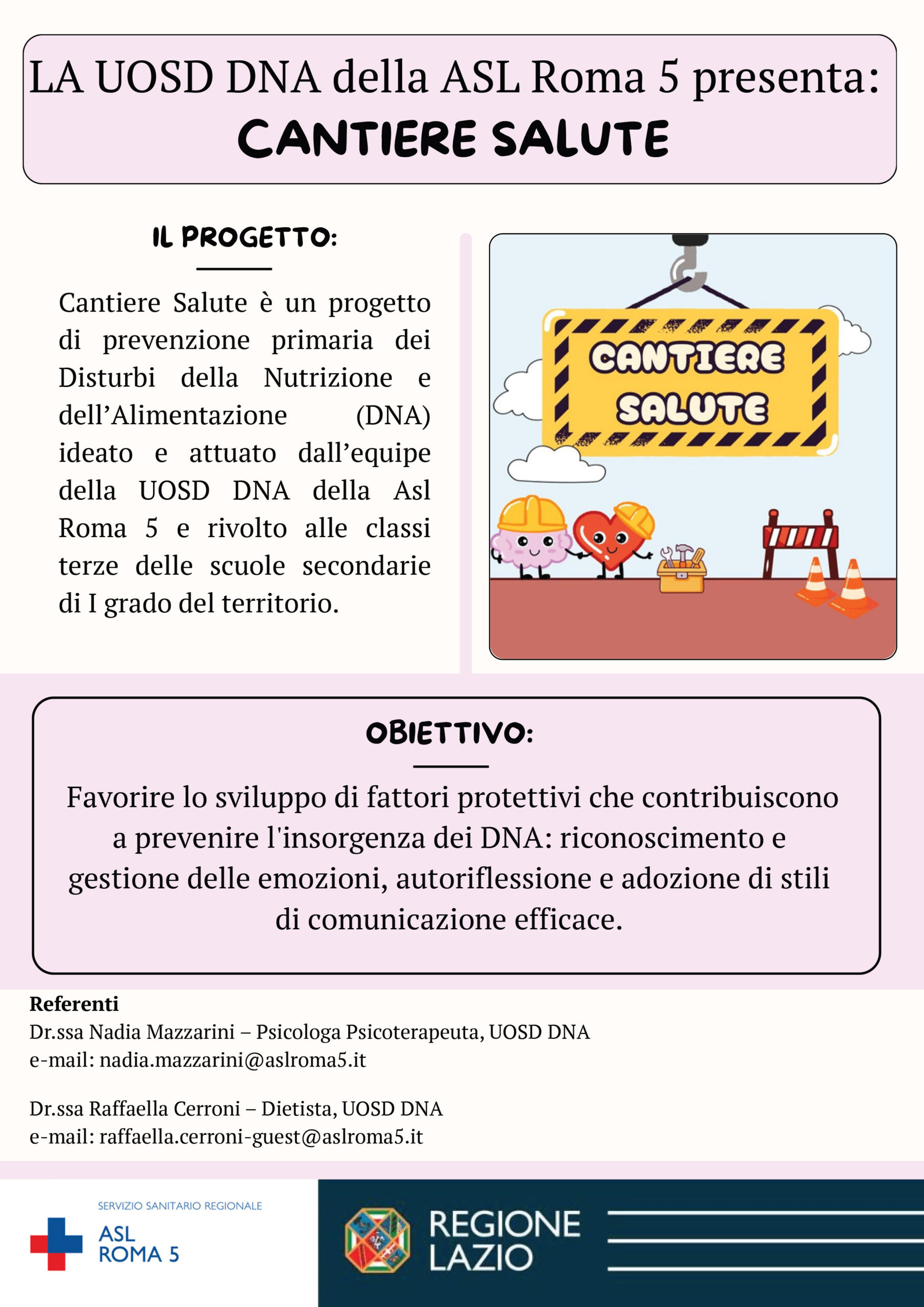 La ASL Roma 5 prosegue il proprio impegno nella prevenzione dei Disturbi della Nutrizione e dell’Alimentazione (D.N.A.) con il progetto Cantiere Salute rivolto ai ragazzi delle scuole secondarie di primo grado del territorio.