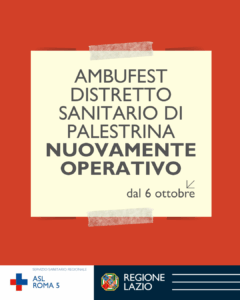 Si informa l’utenza che a far data dal 06 Ottobre l’AMBUFEST del Distretto Sanitario di Palestrina sarà di nuovo operativo, nei prefestivi dalle 14:00 alle