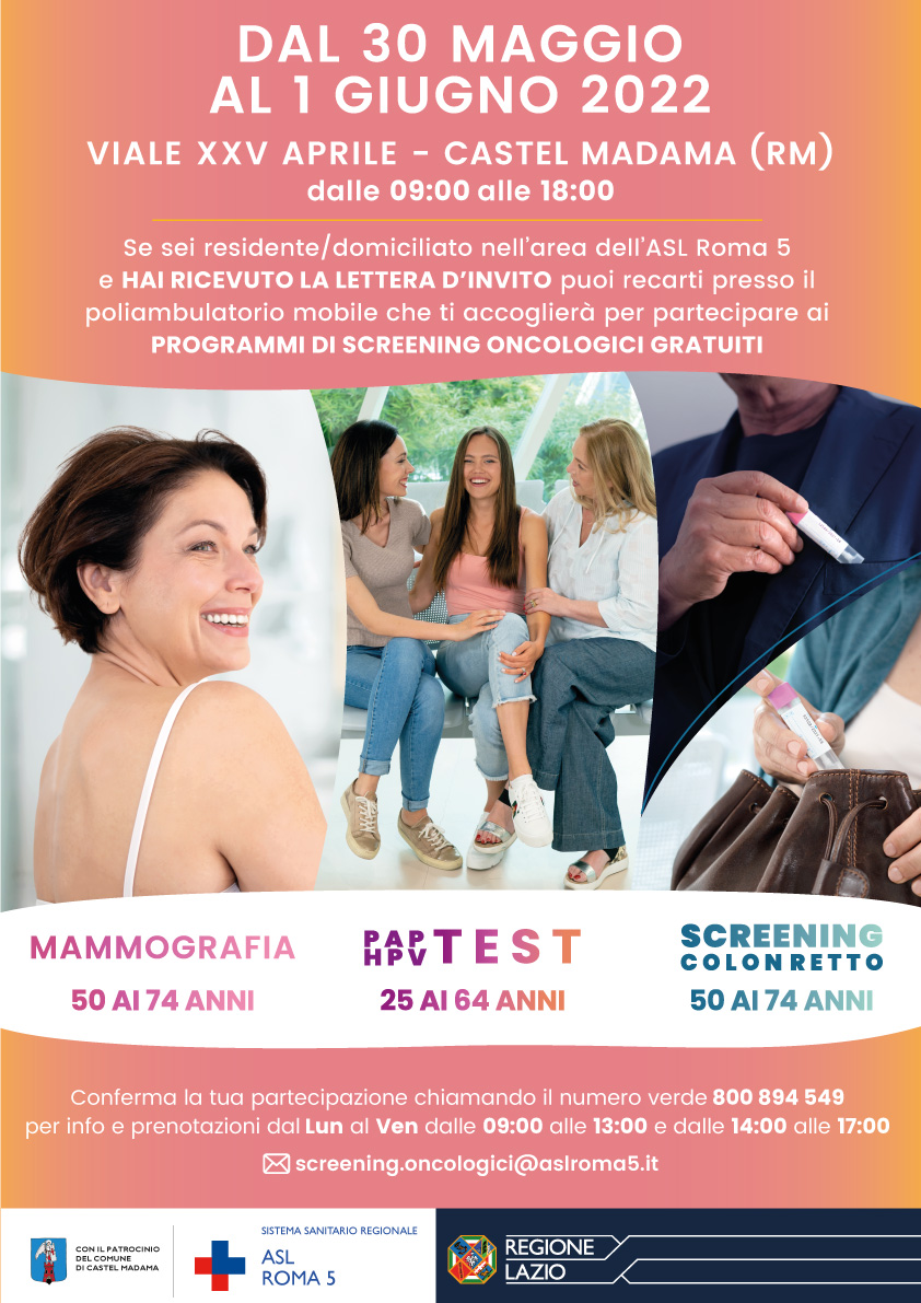 Prosegue il viaggio in truck della prevenzione. Mammografie, consegna kit per screening del Colon Retto per uomini e donne, Pap-test/Hpv-test, questi i servizi offerti all’interno dei programmi di screening promossi dalla Regione Lazio e portati direttamente nelle piazze dei comuni del territorio. Dal 30 maggio al 1 giugno dalle ore 9:00 alle 18:00 l’appuntamento è a Castel Madama, in Viale XXV Aprile.